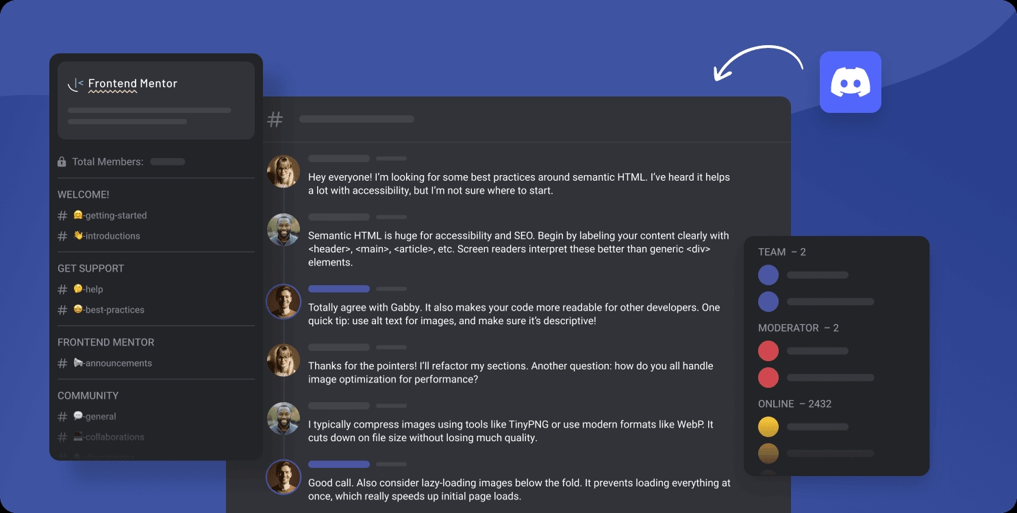 Join thousands of Frontend Mentor community members taking on challenges, sharing resources, helping each other, and chatting about all things code.